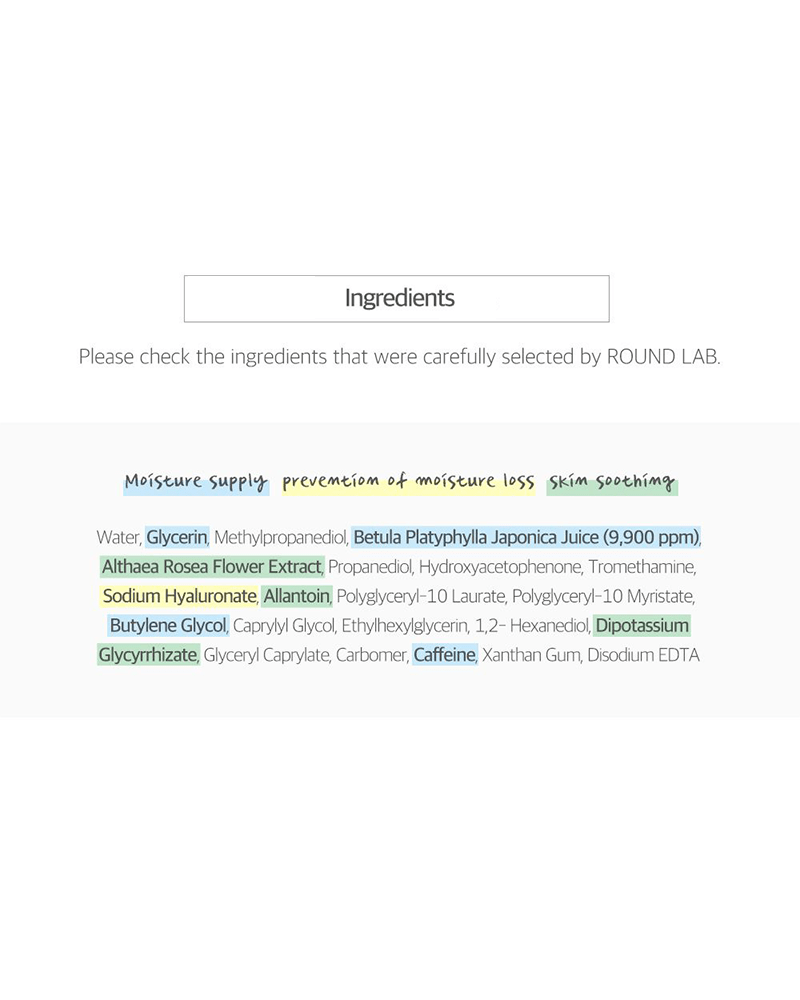 Water, Glycerin, Methylpropanediol, Betula Platyphylla Japonica Juice (9,900 ppm), Althaea Rosea Flower Extract, Propanediol, Hydroxyacetophenone, Tromethamine, Sodium Hyaluronate, Allantoin, Polyglyceryl-10 Laurate, Polyglyceryl-10 Myristate, Butylene Glycol, Caprylyl Glycol, Ethylhexylglycerin, 1,2- Hexanediol, Dipotassium Glycyrrhizate, Glyceryl Caprylate, Carbomer, Caffeine, Xanthan Gum, Disodium EDTA.